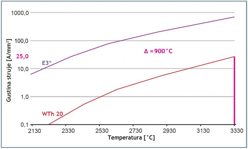 Pri istoj gustini struje E3® elektrode rade na otprilike 900°C nižoj temperaturi nego WTh elektrode i stoga imaju veći kapacitet.