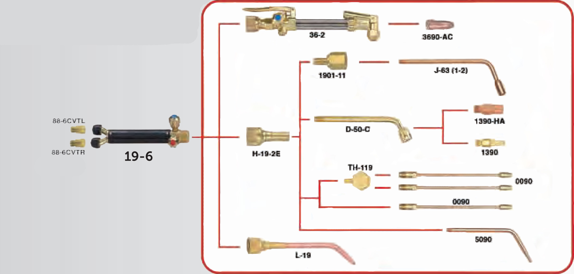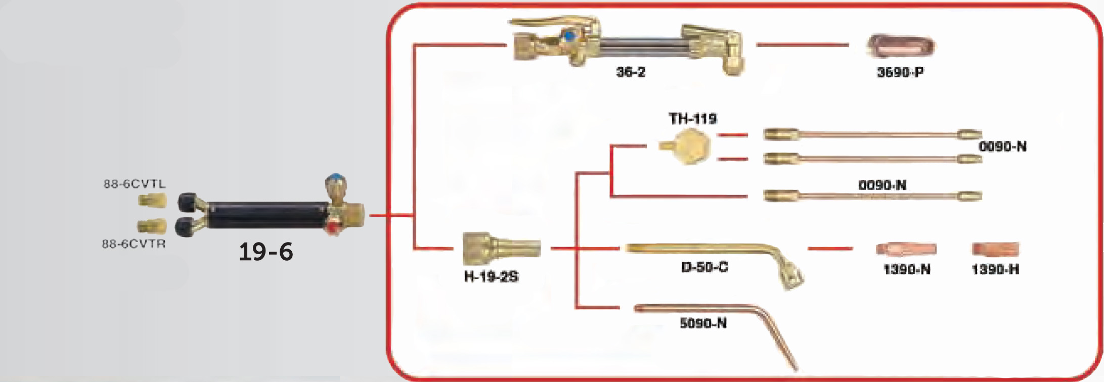 Model 19-6 je višenamenski rukohvat za rezanje, zavarivanje, lemljenje i grejanje. Može se koristiti sa svim gorivim gasovima (kiseonik-acetilen, propan, TNG, MAPP). Ventil se nalazi sa prednje strane rukohvata zbog preciznije kontrole tokom lemljenja.